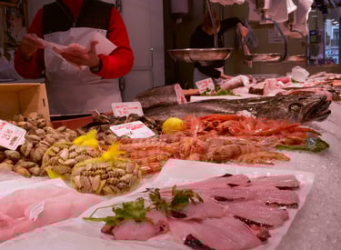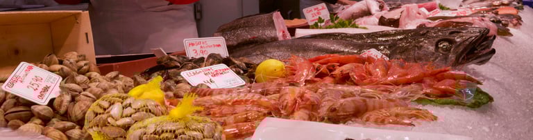 Pescados y mariscos al por mayor, carnes rojas al por menor.